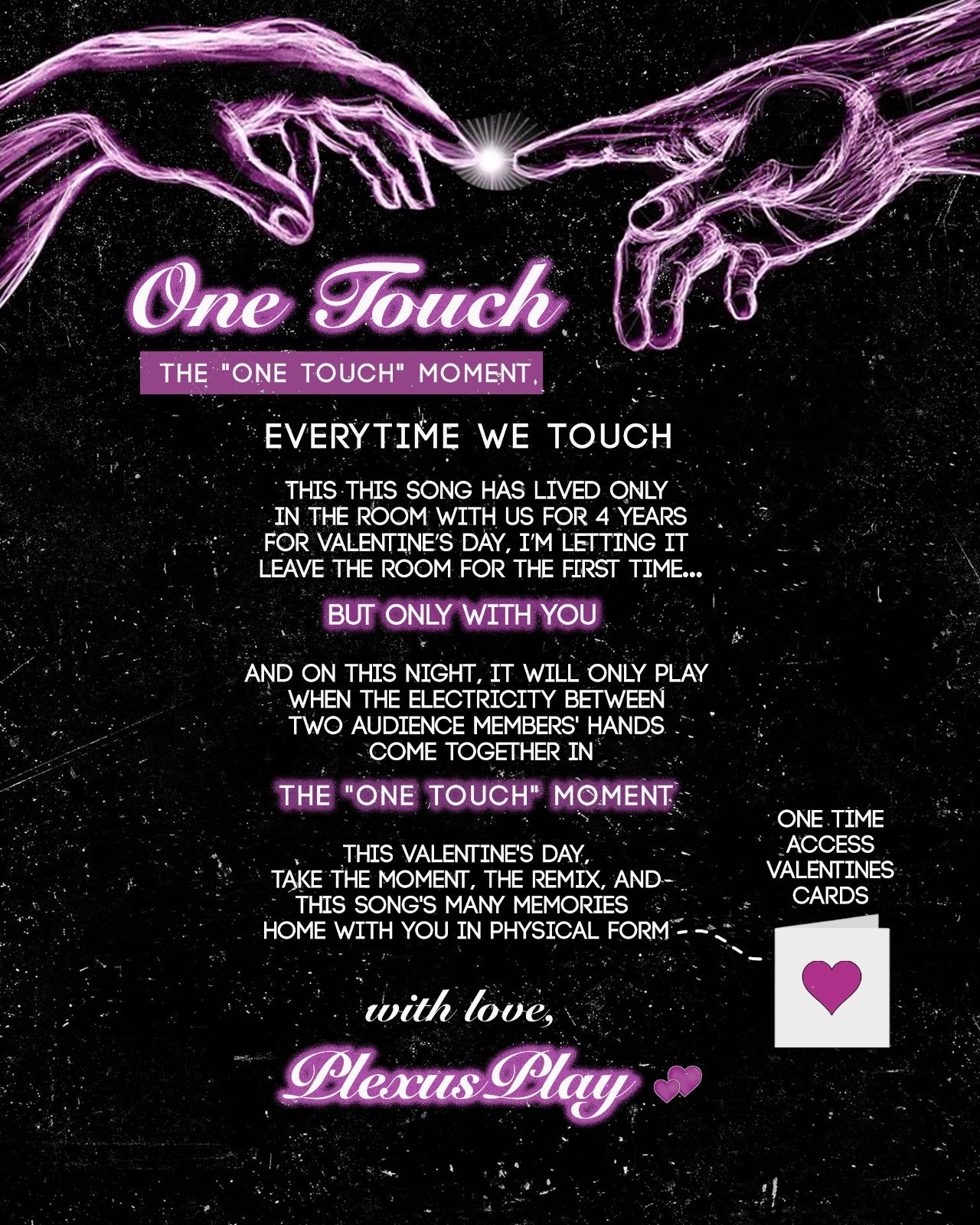 PlexusPlay will pre-release his iconic remix of Cascada’s “Everytime We Touch” via valentine cards. We'll also be inviting two audience members to control the One Touch Moment with just the electricity running between their hands. Discounted tickets for couples!